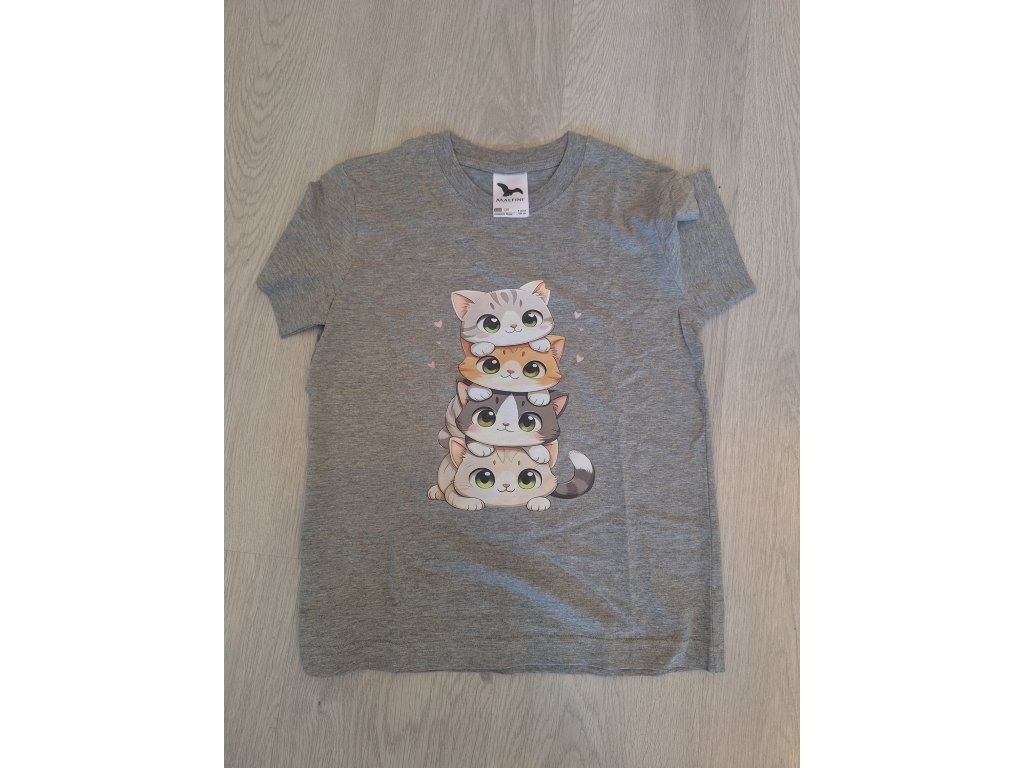 Toto tričko poteší všetky deti, ktoré milujú mačky a hravý dizajn. Na prednej strane je veselá ilustrácia štyroch mačiatok poskladaných jedno na druhom – s veľkými očkami a srdiečkami okolo.