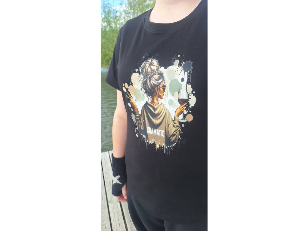 Tričko z kolekcie STYMIO s ilustráciou ženy, ktorá ti chrbtom ukazuje svoj svet – vlasy v drdole, v jednej ruke pohár vína, v druhej pokoj. Okolo nej farby a škvrny, ako z večera, ktorý skončil neskôr, než mal. Slovo „DRAMATIC“ na chrbte jej mikiny nie je nálepka, ale vyhlásenie.