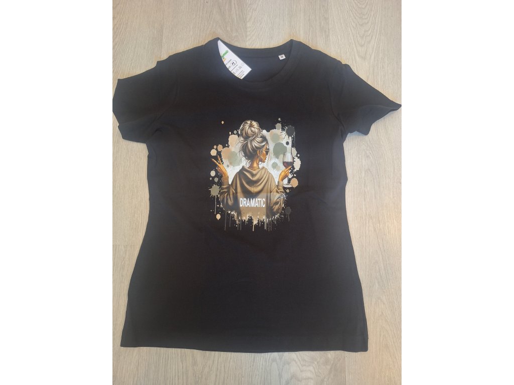 Tričko z kolekcie STYMIO s ilustráciou ženy, ktorá ti chrbtom ukazuje svoj svet – vlasy v drdole, v jednej ruke pohár vína, v druhej pokoj. Okolo nej farby a škvrny, ako z večera, ktorý skončil neskôr, než mal. Slovo „DRAMATIC“ na chrbte jej mikiny nie je nálepka, ale vyhlásenie.