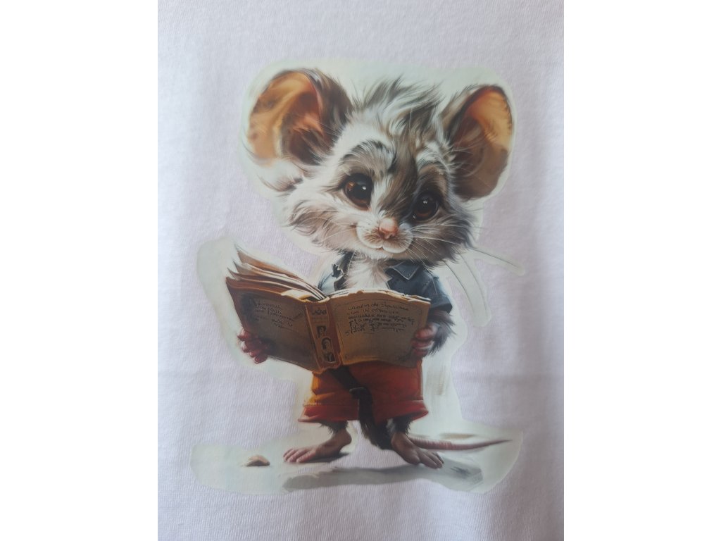 Detské tričko s originálnou ilustráciou malého myšiaka, ktorý drží knihu a pôsobí ako múdry učiteľ či čitateľ príbehov. Tento motív je ideálny pre všetky deti, ktoré milujú rozprávky, fantáziu a majú blízko k objavovaniu nových svetov. Roztomilý dizajn v jemných farbách dodáva tričku hravosť a kúzelnú atmosféru.